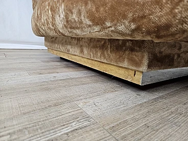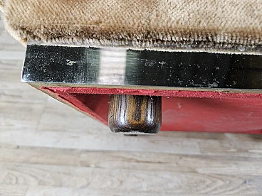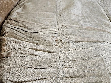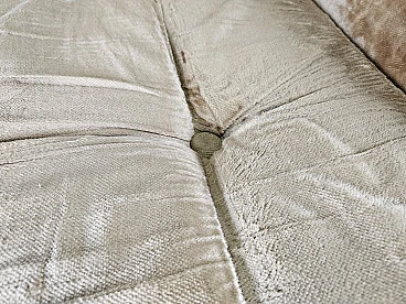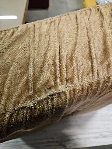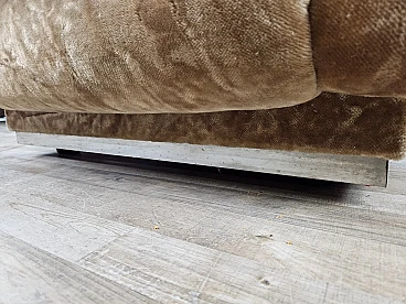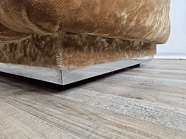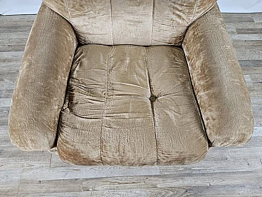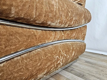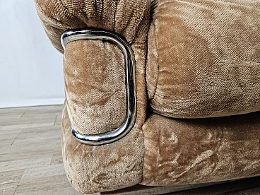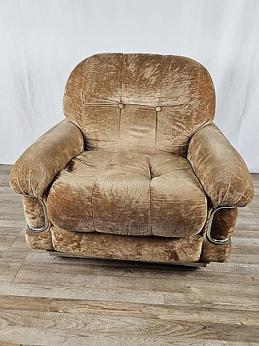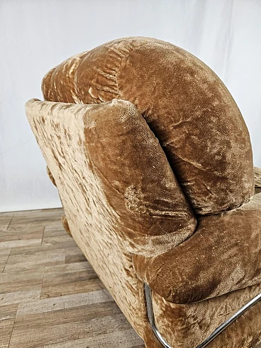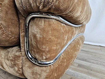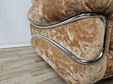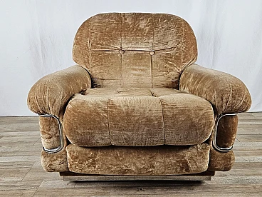 Mid Century armchair upholstered in fabric and decorated with a light steel structure on the sides and base. The two cushions have removable covers, the seat cushion is missing a button as shown in the photo. One of the four steel strips at the base is missing.