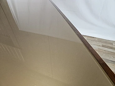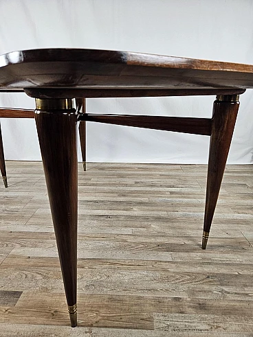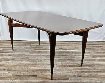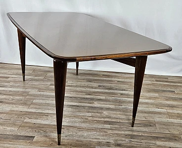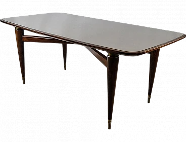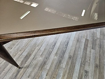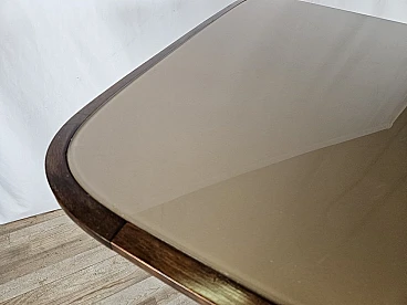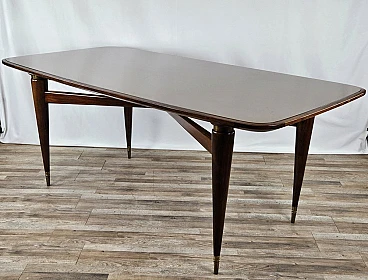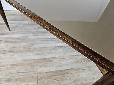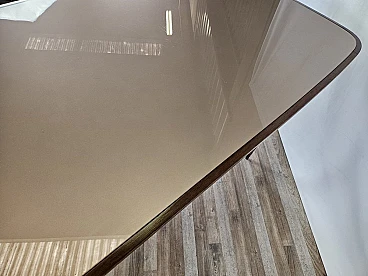 Italian dining table produced between the 40s and 50s, with a design that slowly moves from Art Deco to Italian modernism with linear shapes and well-defined designs. The brown glass top is original from the time, has rounded corners and a wooden frame that completes the entirely walnut structure with brass details and workmanship. The feet and the area between the top and legs are decorated in brass. Table with a modern design already at the time, designed and produced to last over time both structurally and scenographically. Polished with oil and shellac.