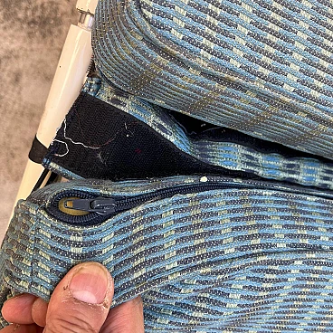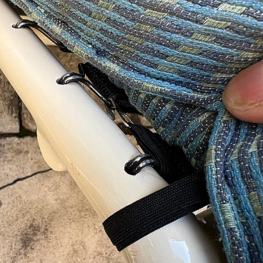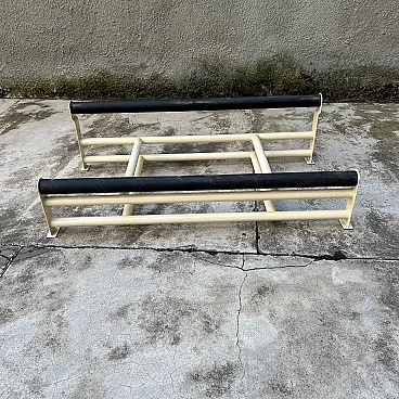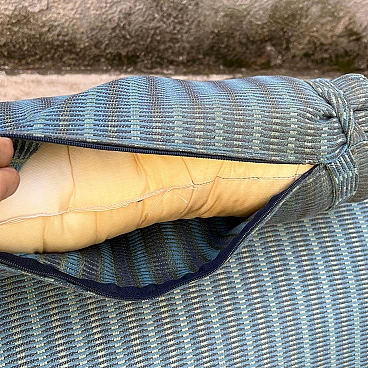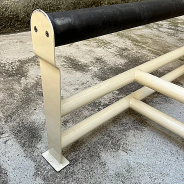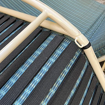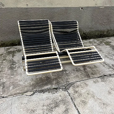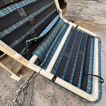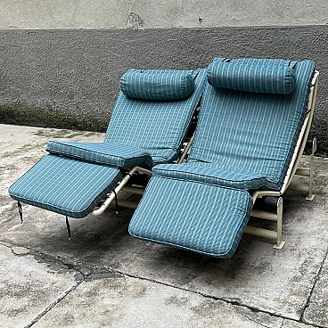 This elegant bench composed of two side-by-side chaise longues is a classic example of 1980s/'90s Italian design, inspired by Le Corbusier's famous LC4 chaise longue. The sturdy, minimalist painted metal structure guarantees stability and durability, supporting two independent seats, each adjustable to different positions for maximum comfort. The cream-coloured, weather-resistant painted metal base is ideal for outdoor or indoor use. The two chaise longues can be adjusted separately to suit the desired position, from sitting to lying down. The upholstery is covered in striped fabric in shades of green and blue, with completely removable covers for easy maintenance. Cushions are attached to the frame by means of large Velcro strips, ensuring stability and easy removal. The seats are supported by elastic straps, ensuring comfort and flexibility during use. The aesthetics recall the iconic design of Le Corbusier's LC4 chaise longue, with clean lines and a strong emphasis on functionality and comfort. This double chaise longue bench represents a perfect blend of modern design and practical functionality, making it a unique piece for lovers of classic and retro design. Perfect for furnishing gardens, terraces or interior spaces with a touch of timeless elegance.