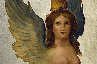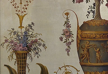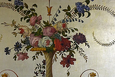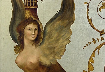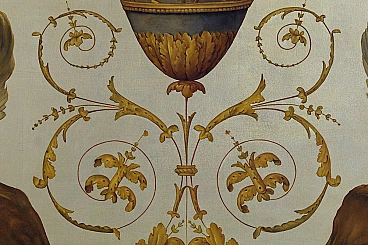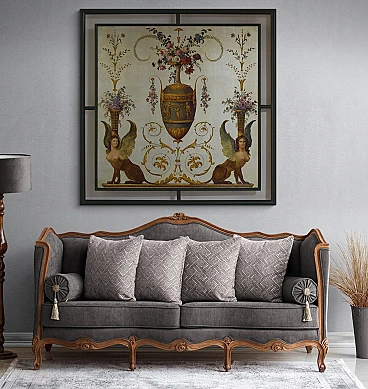 Grotesque oil painting on canvas, gilded with silver leaf. The painting reflects the elegance of the grotesque style, seen in the private chambers of Queen Marie Antoinette. The meticulous detail and harmonious color palette bring the mythological figures and floral arrangements to life. Details: Medium: Oil on canvas with silver leaf gilding Style: Grotesque, Classical Canvas Dimensions: 100x100 cm Frame Dimensions: 125x125 cm Condition: Excellent Features: This artwork features intricate sphinxes and a central urn with classical scenes, framed in a unique open space frame that adds depth and a modern touch. The gold and silver hues of the frame enhance its luxurious feel, making it a perfect centerpiece for any sophisticated interior. Keywords: Grotesque painting, silver leaf canvas, classical art, mythological figures, oil painting, exquisite craftsmanship, timeless elegance, art collection, unique frame, sophisticated decor.