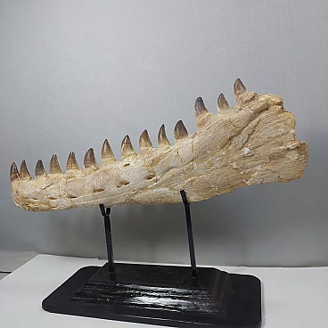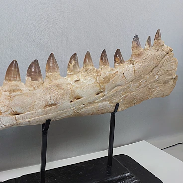 This large Mosasaurus jaw fossil stands out with its well-preserved structure and remarkable detail, highlighting the fearsome teeth and robust bones that defined this apex marine predator. The fossil showcases high-quality preservation, making it a striking piece for any collector or enthusiast of prehistoric life.