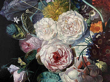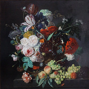 This exquisite oil painting, created in the early 2000s, showcases Angelo Granati's mastery of detail and color. The painting captures a vibrant and meticulously detailed bouquet of flowers, arranged with a variety of blooms in full bloom, complemented by a selection of fruits including grapes and peaches. The richness of the colors and the precision of the brushwork highlight Granati's exceptional skill and dedication to realism. The quality of this piece is of the highest standard, with a finish and detail comparable to that of the great Flemish masters. The painting is framed in a stunning wooden frame, finished with silver leaf and a patina that enhances its antique look. The frame's dimensions are 131x131 cm, providing a grand and elegant presentation for the artwork. The artist's signature, "Angelo Granati," is prominently displayed at the bottom right of the canvas, adding to the authenticity and value of the piece. This painting is a perfect addition to any collection, offering both aesthetic beauty and a testament to Granati's artistry. Condition: Excellent, with no visible signs of damage or wear. Additional Information: Detailed photos available upon request to better appreciate the quality and craftsmanship of this artwork. Angelo Granati, oil painting, floral arrangement, detailed bouquet, fruits, grapes, peaches, realism, high-quality, Flemish masters, silver leaf frame, antique look, signed artwork, collectible, fine art, exquisite craftsmanship
