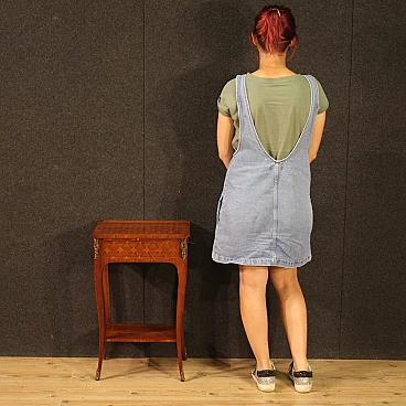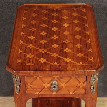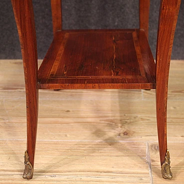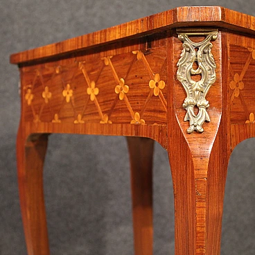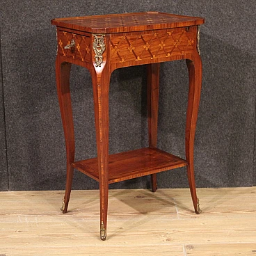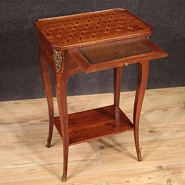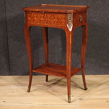 French table of the mid -twentieth century. Pleasantly inlaid furniture with floral and geometric patterns in walnut, bois de rose, maple and fruit woods. Living room table equipped with a drawer of good capacity, two support floors (upper and lower) with good service and small extra -removable desk plan laterally (see photo). Contained measurement cabinet, finished by the center, adorned with chiseled and golden metal decorations. It has some small sign of usury, structurally healthy, overall in good conservative state.
