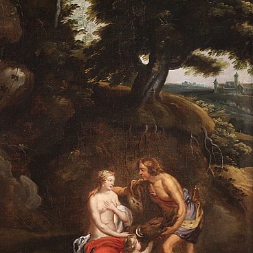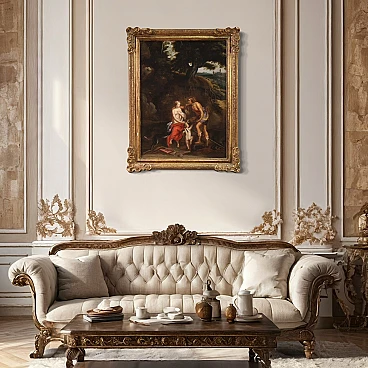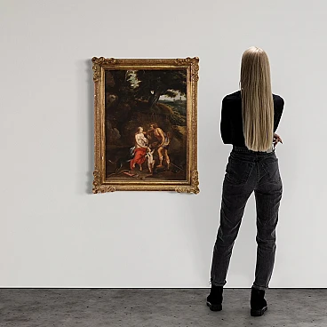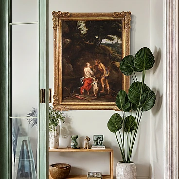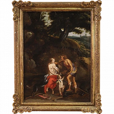 Splendid 17th century Flemish painting. Oil work on canvas depicting a mythological subject of great charm, Meleager offers the boar's head to Atalanta. The Moirae had predicted that Meleager would live until a log of wood was consumed and so his mother Althaea kept him safe in a chest. The father, Oineus, had forgotten to honor Artemis after a lucky harvest. Le Dea takes revenge by sending a gigantic boar that devastates the fields and kills those who leave the city walls. To defeat the monster, Oineo gathers the greatest heroes of the time, including Atalanta, an incredible huntress who infatuated Meleager. She was the first to wound the animal but Meleager himself took care of killing it with a javelin blow. Out of gratitude or love, the boy gave the boar's head and skin as a trophy to Atalanta. A dispute arose with his uncles and Meleager reacted by killing them. Her mother Altea, as soon as she learned that her son had killed her brothers, took the log of wood and placed it on a brazier. A work of notable pictorial quality inspired by a canvas by Peter Paul Rubens (1577-1640), certainly taking the protagonists of the story as a model but immersing them in an Arcadian landscape of Flemish taste not present in the original composition. Spectacular 19th century frame in carved and gilded wood, with some drops in gilding and signs of aging (see photo). Painting already restored with relining, replacement of the frame and recovery of color in small spots. Overall in good state of conservation. Painting light H 83 x W 62 cm.