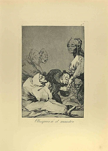 Obsequio á el Maestro is a black and White aquatint, drypoint and etching printed in blue-black ink on laid paper from Caprichos realized after Francisco Goya in 1881-1886.6th Edition.Very good impression.Madrid: Calcografia Real, 1881-1886Sheet size: 31 x 23.The first edition of Capricci was published on 6 February 1799 and put on sale the same day in a liquor and perfume shop on Calle DesengaÏo, in Madrid. The same day, in the Diario de Madrid, Goya became concerned and tried to reiterate that the Capricci were a work born from his imagination and without real references. However, worried about the public reaction and the inquisition, he decided after only 27 copies were sold to withdraw the edition from the market and so in 1803 he donated the remaining copies of the Caprices and the related plates to the King in exchange for a pension for his son. The work was subsequently reprinted by the Calcografa Nacional of Madrid in several editions from 1855 to 1937 after the first in 1799.