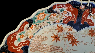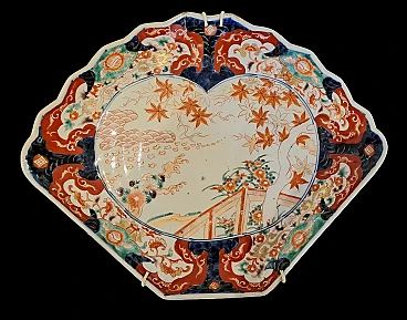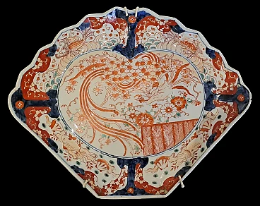 Rare pair of fan-shaped plates decorated with floral motifs in cobalt blue below deck, brick and gold above deck. Japan, Imari manufacture, Meiji period (1868 - 1912). The dimensions are: width 36, height 29 cm.