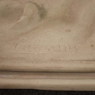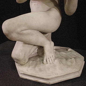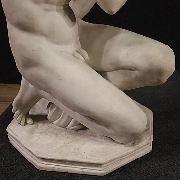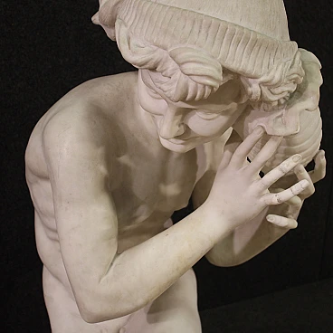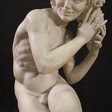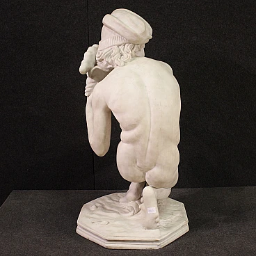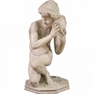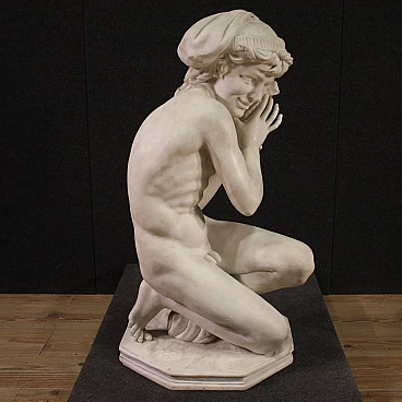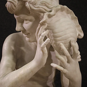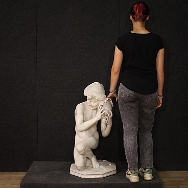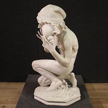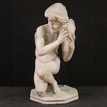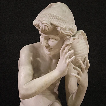 Large white marble statue from the second half of the 19th century. Work of notable quality depicting a young Neapolitan fisherman laughing mischievously while holding a shell to his ear. It has a "Carpeaux" signature on the base (see photo), referable to the famous French sculptor Jean-Baptiste Carpeaux (1827-1875), lacking authenticity. The original work was created in 1863 and was so successful that he created other versions in marble and bronze in the following years. The young fisherman is sculpted without clothes, he wears only a cap and while he kneels he tries to listen to the sound of the sea from the shell that he holds with both hands. The sculpture has a beautiful patina but with four fingers restored during the 20th century (see photo). Overall, it is in a good state of conservation, with some signs of aging.