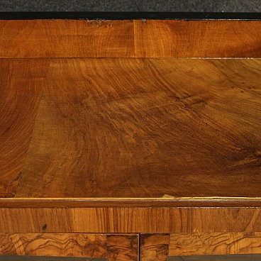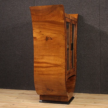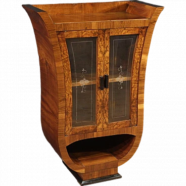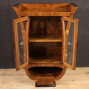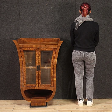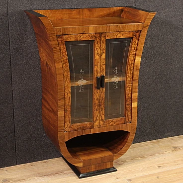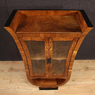 Italian showcase from the mid-20th century. Goblet cabinet in Art Deco style, veneered in walnut, briar and ebonized wood with beautiful lines and pleasant decor. Two-door display cabinet with glass adorned with floral decorations, interior complete with a flatter shelf at the base, of reasonable capacity. Furniture of small size and excellent proportions, easily placed in different parts of the house. Showcase that rests on a wooden base that offers reasonable stability. Furniture with a particular shape, difficult to find, for antique dealers and interior designers. Structurally sound display case with some small signs of wear. Overall in good state of conservation.