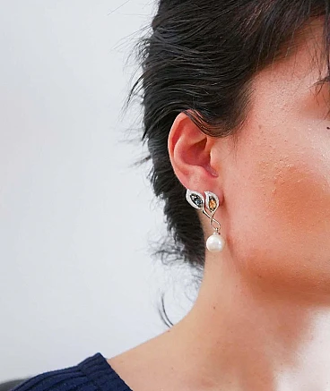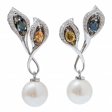 White gold earrings with pearls, diamonds and sapphires, 2000s