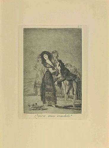 Quien Mas Rendido is a black and White aquatint, drypoint and etching printed in blue-black ink on laid paper from Caprichos realized after Francisco Goya in 1881-1886 .6th Edition.Very good impression.Madrid: Calcografia Real, 1881-1886Sheet size: 31 x 23.The first edition of Capricci was published on 6 February 1799 and put on sale the same day in a liquor and perfume shop on Calle DesengaÏo, in Madrid. The same day, in the Diario de Madrid, Goya became concerned and tried to reiterate that the Capricci were a work born from his imagination and without real references. However, worried about the public reaction and the inquisition, he decided after only 27 copies were sold to withdraw the edition from the market and so in 1803 he donated the remaining copies of the Caprices and the related plates to the King in exchange for a pension for his son. The work was subsequently reprinted by the Calcografa Nacional of Madrid in several editions from 1855 to 1937 after the first in 1799.
