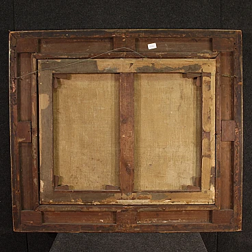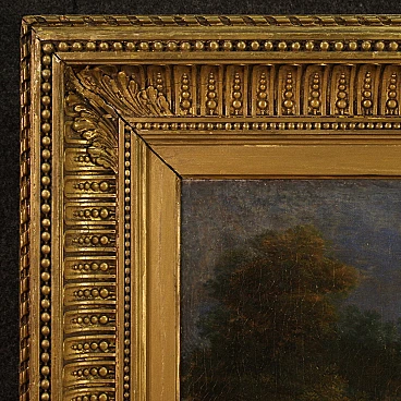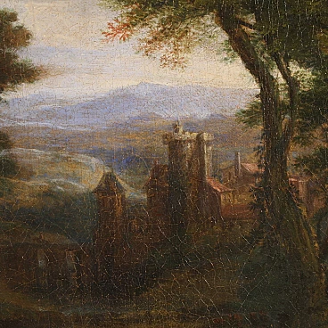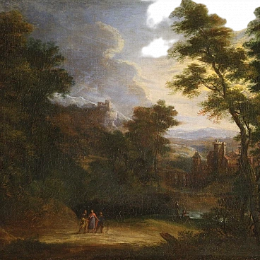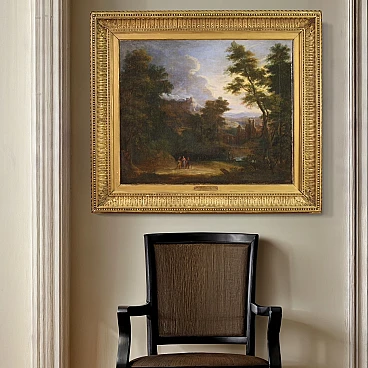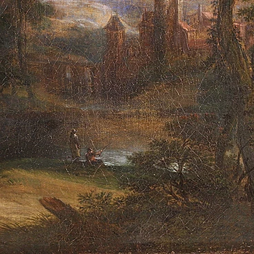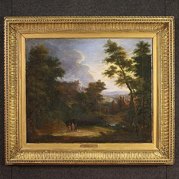 Ancient landscape with figures from the 17th century. Oil work on canvas depicting a splendid Flemish landscape which frames a famous episode of the New Testament, the appearance of Jesus on the road to Emmaus after the resurrection. Two disciples were walking along the road when they met Christ. They immediately don't recognize him and talk to him about their sadness for the recent and terrible events that had affected their teacher. He persuades them to dine with him and at the breaking of the bread they finally recognized him. The painting has a plate (see photo) with the reference to Jacques D'Arthois (1613-1686) and David Teniers (1610-1690), which lacks authenticity. The very high quality of execution and the particular type of representation make the veracity of the plaque plausible, also because it was David Teniers himself who took care of the figures in Jacques D'Arthois' landscapes. Spectacular 19th century wood and plaster frame, with some signs of aging. Work already restored with relining, replacement of the frame and color recovery in small spots. Overall in excellent state of conservation. Painting light H 60 x W 73 cm.
