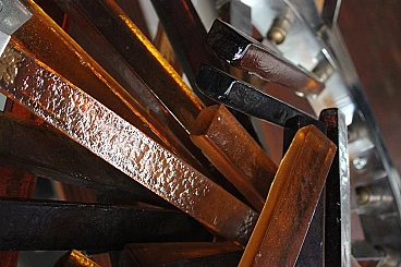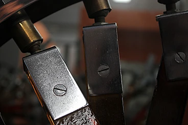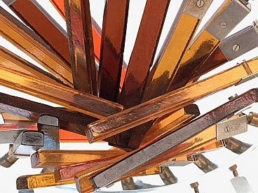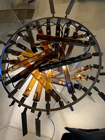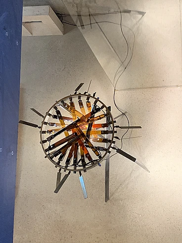 Characteristics: Circular steel band, on the external side it has n. 12 brass supports to which adjustable steel slats are fixed, on the internal side n. 24 always adjustable brass and steel supports that accommodate a parallelepiped in amber-coloured glass paste in different shades.