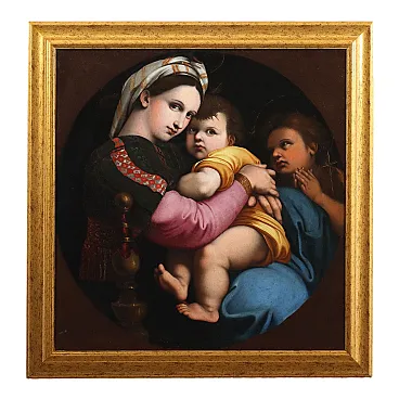 Oil on canvas. This is a copy of the famous work by Raphael Sanzio (1483 -1520), painted by the Urbino artist in 1513-1514 and currently housed in the Palatine Gallery of Palazzo Pitti in Florence. The figures, inscribed in a tondo as in the original work, consist of Mary, seated on a rich chair, the Infant Jesus in her arms, and St. John at her side; while the Mother and Child look forward, Mary directly towards the viewer, Jesus a little further away, Little John emerges from the dark background and addresses a gesture of prayer to Mary. The chair on which Mary sits is a Chamber chair, i.e. one of the privileged seats of the Pope, a strong symbol of authority in doctrine and certain teaching, attributes of Mary: she is the Mother of God who sits in the cathedra. Particular is the colour of Jesus' robe, a central yellow stain that recalls the robe of the “Servant”, a warning to the Pontiff who commissioned the original work. The work is presented in a stylish frame.
