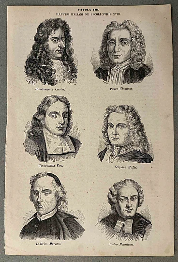 Illustrious Italians of the 17th - 18th Century is a lithograph on paper realized in 1862.The artwork belongs to the Suite Uses and customs of all the peoples of the universe: " History of the government, of the laws, of the militia, of the religion of all the nations from the most remote times up to the present day".Very good condition.