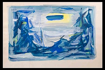 Abstract Composition in Blue is a painting in tempera and watercolor on ivory-colored paper, realized in the 1980s by French artist Émile Marze (1930-2009).Good conditions.The artwork is expressed through deft and rapid strokes, poetically through harmonious and congruence colors.