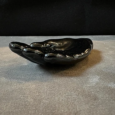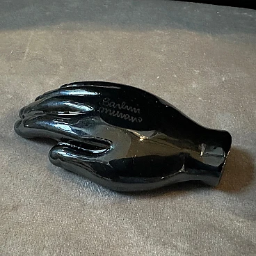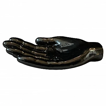 This paperweight reflects the elegance and modern artistry of 1990s Murano glass while also carrying the signature style of one of the most renowned Venetian glassmakers of the 20th century. The paperweight is made from black Murano glass, which is known for its high quality, clarity, and smooth finish. Murano glass is hand-blown and crafted by skilled artisans, and Alfredo Barbini was a master of this art form. The paperweight depicts a hand in a modern, abstract fashion. The hand appears as a sculpted form, smoothly emerging from the glass. The black Murano glass adds a contemporary, bold look to the piece. Given that it's a paperweight, the item is relatively small, fitting comfortably in the palm of the hand., it's in perfect condition and acid signed Barbini Murano on the bottom.