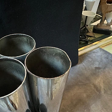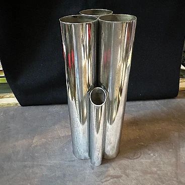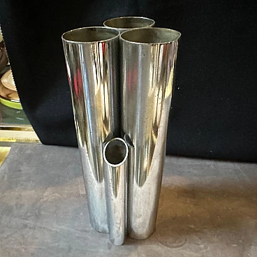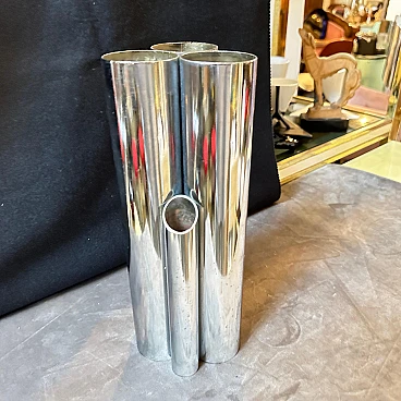 This chromed metal vase exemplifies the balance between form and function, with its sleek modernist design and versatile use, aligning well with Gio Ponti’s iconic design philosophy. The combination of chrome material and cylindrical shapes embodies the elegance and innovation of the 1960s modernist style. The vase’s design would fit well in a contemporary setting or as part of a mid-century modern collection, adding a touch of minimalist glamour. The vase is constructed from several polished metal cylinders, grouped together to form a cohesive, sculptural piece. The varying heights of the cylinders create a dynamic, architectural silhouette, reminiscent of modernist design principles. The vase is made of chromed metal, giving it a shiny, reflective surface. The chrome finish adds a futuristic and industrial feel, which was a popular material choice in mid-century modern design. The highly polished surface mirrors its surroundings, enhancing the piece's sleek and sophisticated appearance. It has small signs of use and age visible on pics, one under the base isn't visible when the vase is placed.