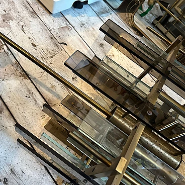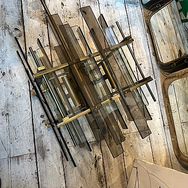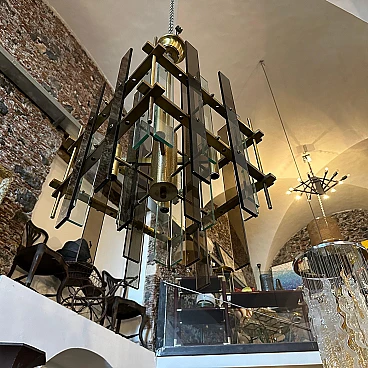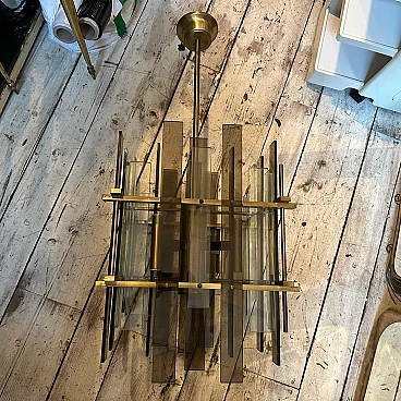 This square italian chandelier is a striking example of a 1970s mid-century modern Italian design. It features a geometric, industrial aesthetic that is typical of that era. The chandelier is constructed with a series of vertical glass panels arranged in a rectangular, grid-like pattern. These panels are layered and intersect at various points, creating a sense of depth and complexity in the design. The glass used is smoked and clear, contributing to the chandelier's modern and somewhat futuristic look, which was a popular trend in 1970s design. The gilded metal has normal signs of age visible on the photos, it's in working order and ready for U.S., it needs only regular e14 bulb lamps.