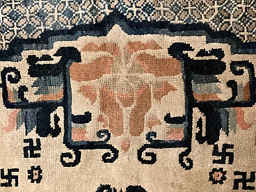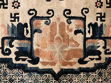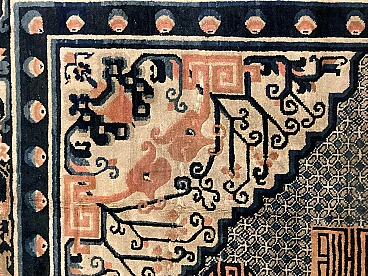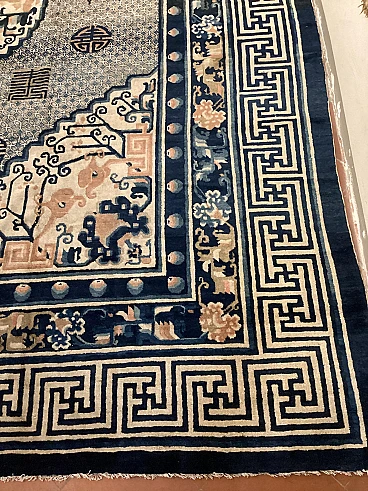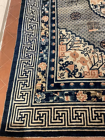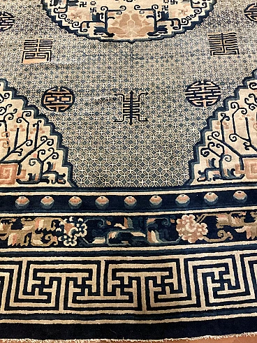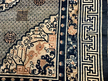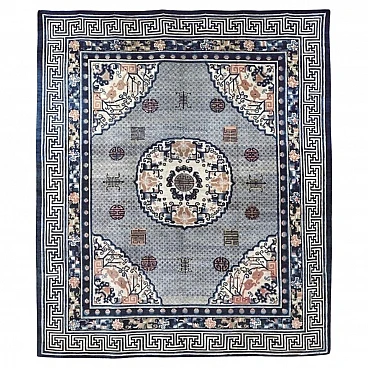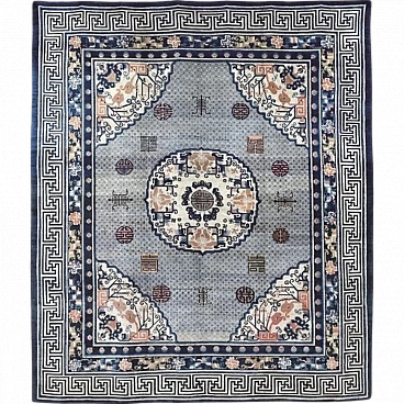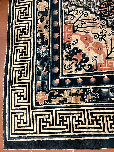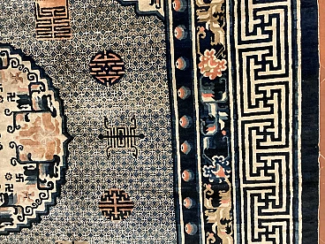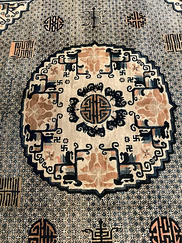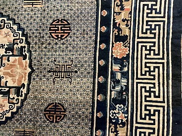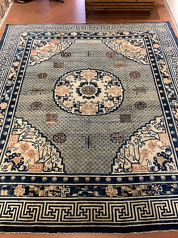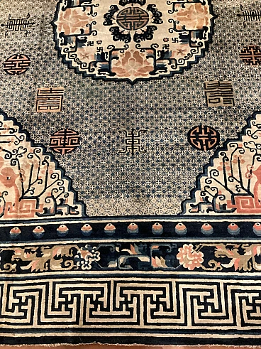Mongolian hand-knotted rug, 100% wool 19th century. A large medallion opens on a central small lattice field. In the center is the SCHOU symbol, representing longevity and good luck, surrounded by 5 bats. The bat is considered a symbol of happiness, the 5 bats stand for many happinesses, namely longevity, wealth, health, virtue worship and good death. Reinforcing this field representation are various representations of SCHOU surrounding the central medallion. Various frames enclose the field, the outermost having a beautiful greca, the central one peony designs, and the closest to the field a border of pearls. Its colors range from deep blue to peachy pink. Dimensions: 360 x 320 cm State of conservation: very good