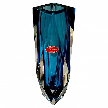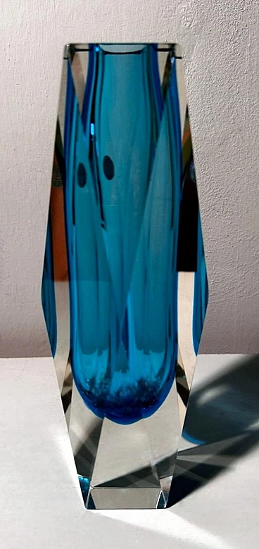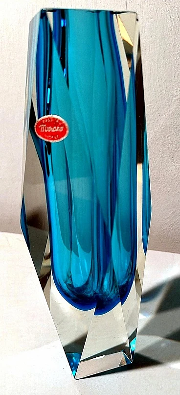 Please read the entire description carefully, as we aim to provide detailed technical and historical information to ensure the authenticity of our objects. This substantial and streamlined Murano glass vase is distinguished by its harmonious blend of two colors: blue and transparent. The design is characterized by sharp, decisive cuts and accentuated edges. Although the vase lacks an attribution mark or proof of authenticity, we can confidently attribute it to the Mandruzzato firm, as it is well-documented in design history. The vase was produced in Murano between 1960 and 1964 using the submerged glass technique, an ancient process that, starting from blown or solid glass, allows for multiple overlapping layers of different colors, creating a striking chromatic effect. This effect is achieved by immersing the glass in crucibles containing different colors, a complex operation performed exclusively by highly skilled Master Glassmakers. The Mandruzzato company, founded in 1934, has carried on a family legacy for generations, creating unique furniture and design pieces. Its craftsmen, true Masters of Glass, have established the company as one of Murano's finest. In 2000, the leadership of the company passed to Alessandro Mandruzzato, a Master Glassmaker born in 1970, who, by developing and modifying both traditional and innovative techniques, creates unique objects in collaboration with renowned designers, while always honoring tradition. Our vase belongs to the traditional period of the Mandruzzato company but stands out with its simple yet modern design, featuring a unique geometric shape and exceptionally pure, vibrant colors. The vase is in excellent overall condition. Measurements: width 11 cm, depth 11 cm, height 28 cm. For all our shipments, we use special packaging materials (wooden crates, styrofoam, etc.) to ensure maximum protection and safety of the objects.