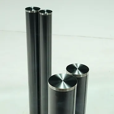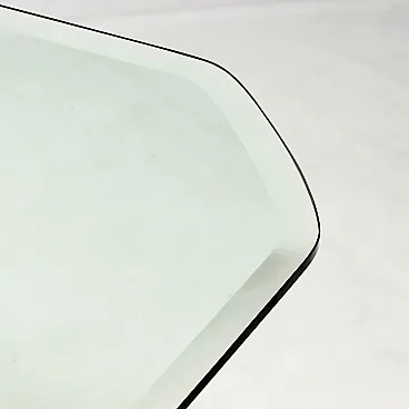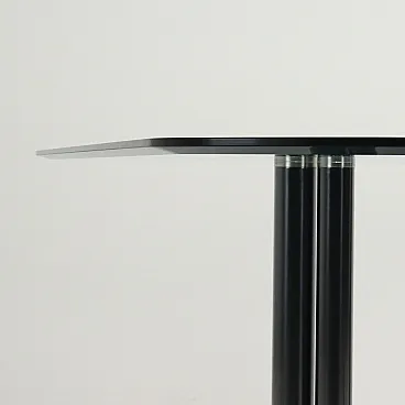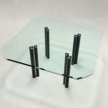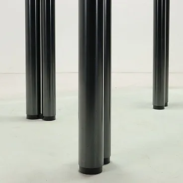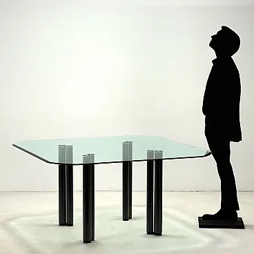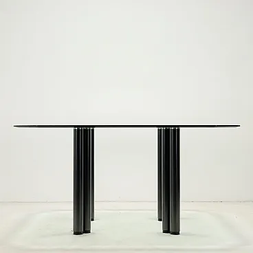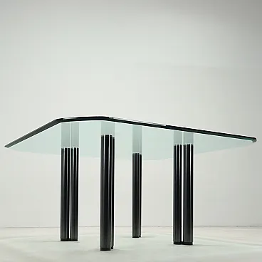 Dining table model \"Eta Beta\" with glass top and four pairs of metal legs; furniture designed in 1978 by Marco Zanuso for Zanotta.