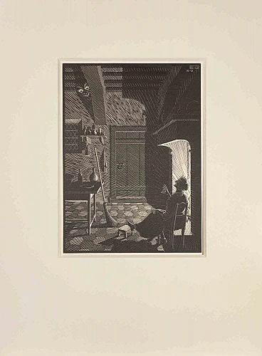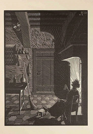 Woodcut print from the Series "Der vreeselijke avonturen vas Scholastica" (The Terrible Adventures of Scholastica).Edition of 300, published by A. J. van Dishoeck.Unsigned, ass issued.Excellent condition.Ref. 'Leven en werk van M.C. Escher' by Bool et al., Meulenhoff Amsterdam, no. 191.