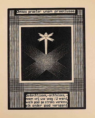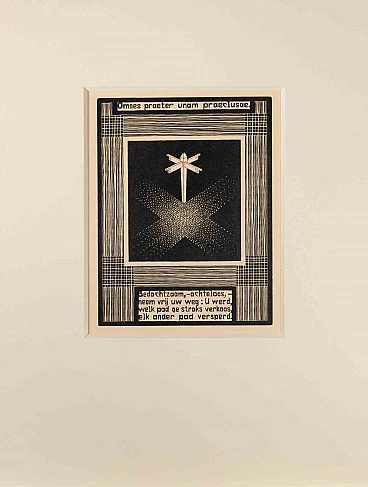 Woodcut print realized by Escher for the series "Emblemata", and published in 1931.On Hollande van Gelder paper.Edition of 300.Unsigned, as issued. Excellent condition, matted.In this work, Escher realized 24 woodcuts depicting as many phrases created by his friend A.E. Drijfhout, alias G.J. Hoogewerff, in latin and dutch.Ref. 'Leven en werk van M.C. Escher' by Bool et al., Meulenhoff Amsterdam, no.173