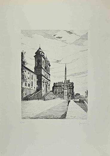 Giuseppe Malandrino, View of Trinità dé Monti, Etching 1960s-1970s