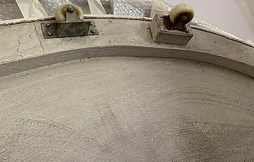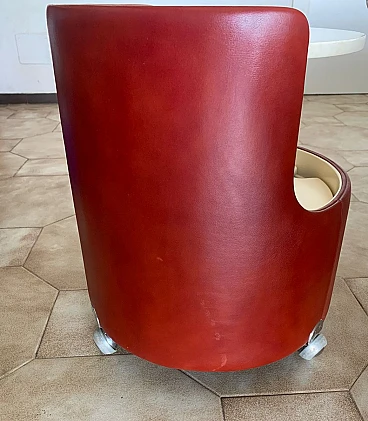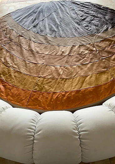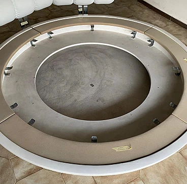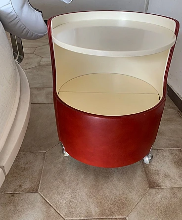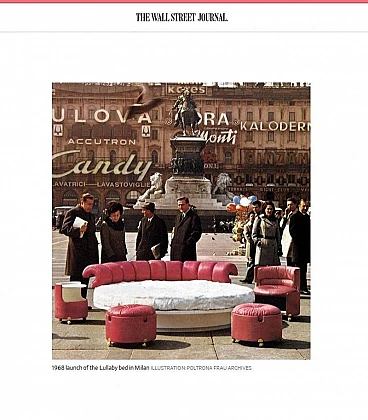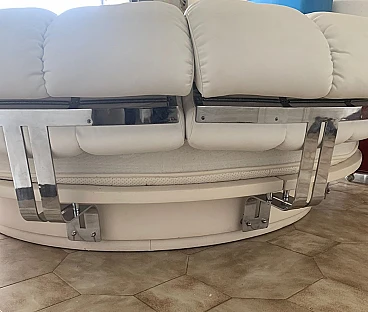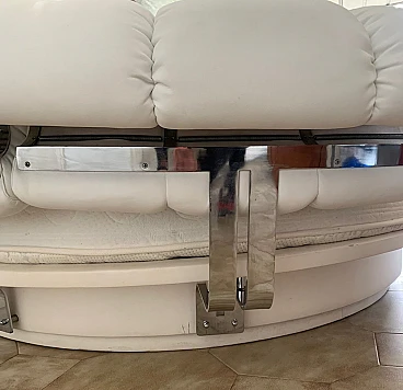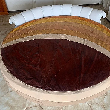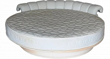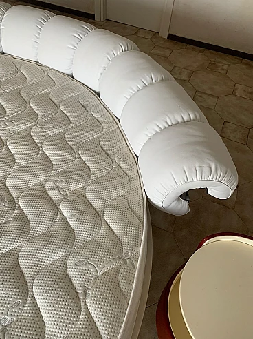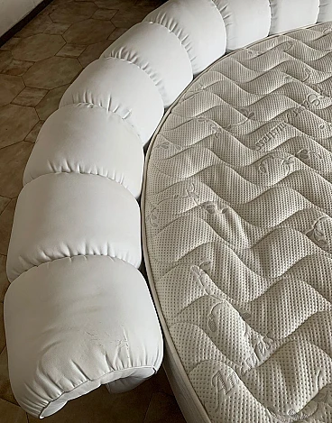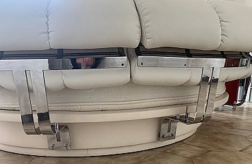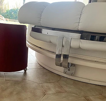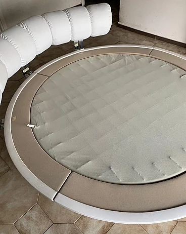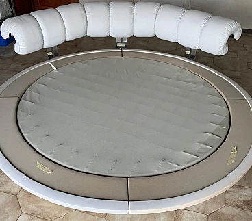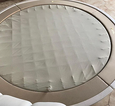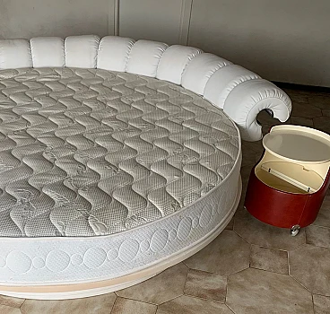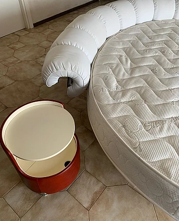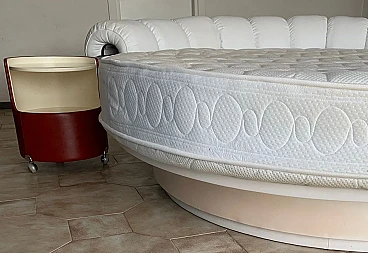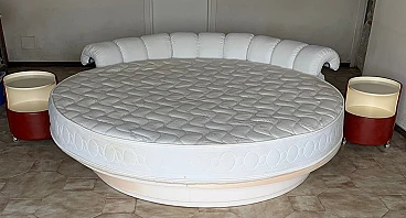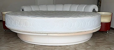 The Lullaby bed dates back to 1967, designed by Luigi Massoni for Poltrona Frau... an original and timeless product with the singular peculiarity of having a round and swivel base. Even today it is an object of great impact and represents the historical period in which it was created. The set on sale here consists of the Lullaby bed and two bedside tables. It is a 360° rotating bed... Steel and genuine leather characterize the headboard and the structure of the bed which rests on a rotating system, thus allowing the mattress to rotate without moving the bed. This set also includes the leather bedspread. Leather also covers the two bedside tables... which can be moved easily thanks to the chrome wheels and are equipped with a hidden storage compartment in the lower part. Assembly instructions are present. Dimensions: L. 210 x D. 245 x H. 71 cm Mattress: D. 200 cm Bedside tables: D. 43 x H. 52 cm