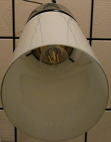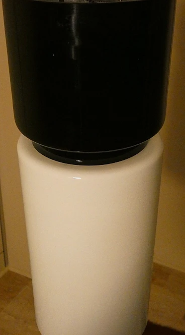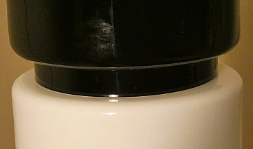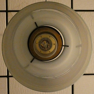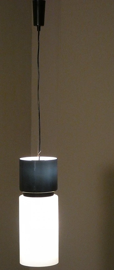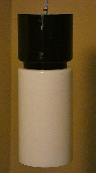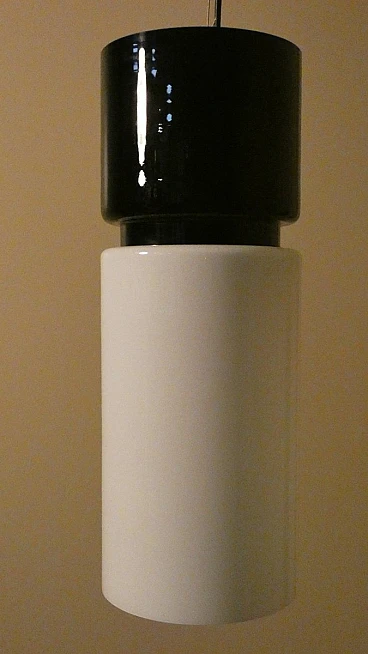 Set composed of two suspensions in opaline glass and glazed ceramic. Made in Murano, these two lamps are typical of the minimalist and elegant design of the 1960s. On the lower lighting body, in opaline glass and with E27 bulb connection, a glazed ceramic crown is superimposed in support which contains three lamp holders with E14 connection... in this way the suspension provides an illuminating light from below and a soft and less light intense from above. They are beautiful and elegant lamps in their minimalism capable of adapting to any environment. They can also be powered with LED bulbs. Lamp body dimensions: H.42 x D. 15 cm