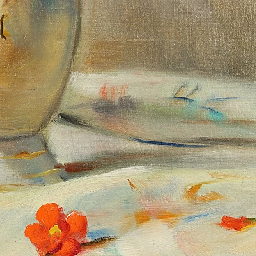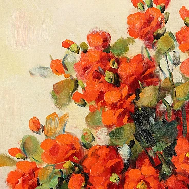 Oil on canvas. Signed lower right. Alfio Paolo Graziani chose the faithful transposition of reality on his canvases, creating almost hyper-realistic compositions for the precision in reproducing the various materials and surfaces, as well as the effects of the light incident on them. Nicknamed \"Prince of Flowers\" for the abundant production of floral compositions, he also created landscapes, portraits and still lifes. Presented here is a bright bouquet of red roses, arranged in a decorated ceramic vase. The work is presented in a period frame.