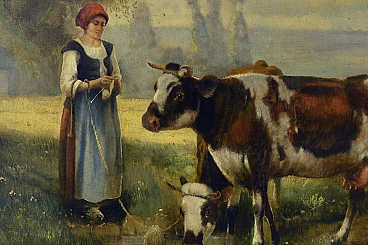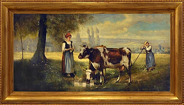 Countryside scene by Emilio Pergola. The painting is set in a gold leaf gilded wooden frame. Painting size cm.50x100