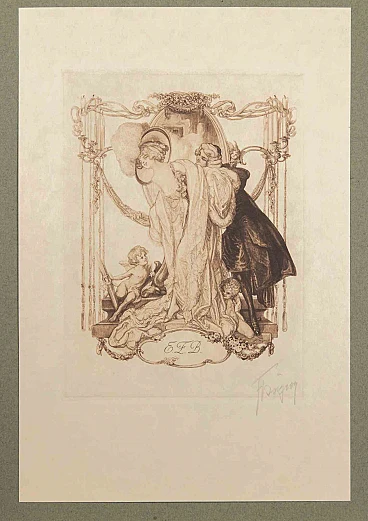 Héliogravure on japanese paper realized by Fraz von Bayros in 1913 for Ex Libris Verlag K. Th. Senger, Munich.Mounted on passepartout. Edition of 260, hand signed in pencil by the Artist.Ref. Brettschneider 42.Very good condition.