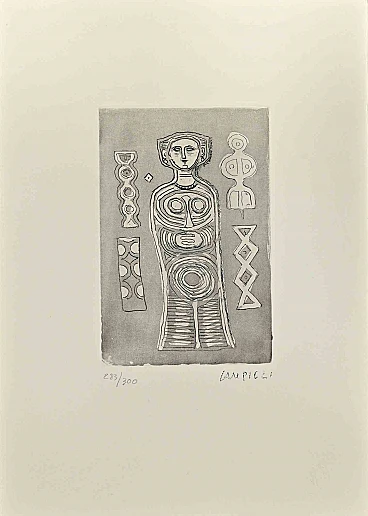 Idol is a print realized by Massimo Campigli in the 1970/1971.Etching on paper.Signed and numbered, edition of 300 prints.This artwork it is part of a series of works created in the last period of the artist and printed at the turn of the year of his death, which took place in 1971. Good conditions.
