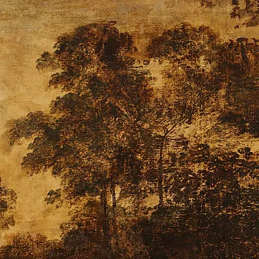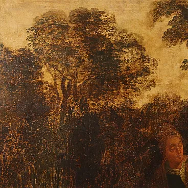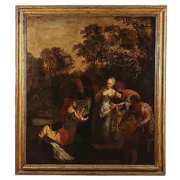 Oil on canvas. The painting looks at the similar work by Paolo Veronese (1528-1588), datable around 1560-70 and now preserved in the Prado Museum, of which our painting takes the composition of the figures, changing the entire background and the clothing of the characters. Veronese\'s work was so successful that it was replicated by his own workshop, with numerous variations: our work probably derives from one of these copies, replicated at a later time. The episode depicted is narrated in the biblical book of Exodus and tells of the finding of the little Moses, left by his mother in a basket along the banks of the Nile River, to save him from the massacre of the children of Israel perpetrated by the Pharaoh; the Pharaoh\'s daughter, who went to the river with her entourage, finds him and saves him, adopting him. The figures in the scene are depicted in eighteenth-century clothing, in particular the princess\' dress stands out for its richness and sumptuousness; the only exotic element is the presence of a colored servant in the retinue, while the background also refers to a landscape of northern Europe, with thick woodland vegetation. The painting, restored and relined, is presented in an 11th century frame.