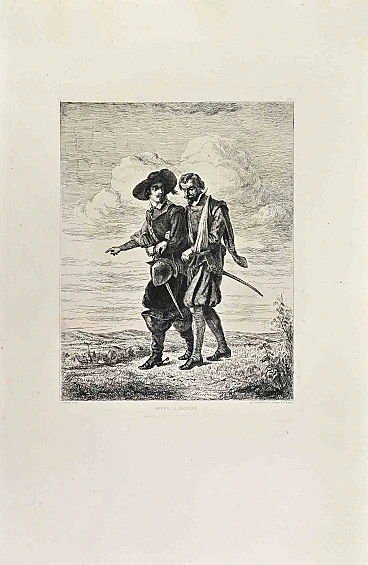 Apres la Bataille is a black and White etching realized by Hermann Maurice Cossmann in the 1860s. Titled in the lower.Image size: 30x23.Very good impression with wide margins and a very fresh inking.Realized for the "Société des Aquafortistes. Born on the initiative of the publisher Alfred Cadart, the Société des Aquafortistes had the aim of reviving etching which had slowly been replaced by the cheaper lithography. Among the first participants in the association were the Barbizon painters who helped raise the medium to new heights, but over 100 leading French artists contributed to the creation of the 300 engravings. With the publication of the last volume in 1867 the society, given the high costs and modest commercial success, was dissolved but new experiments were soon born: Félicien Rops, former member, founded the Société Internationale des Aquafortistes in Brussels in December 1869 , while in London The Portfolio and the Society of Painter-Etchers were born respectively in 1870 and 1880. In Paris, in 1873, the magazine Paris à l'eau-forte was founded.