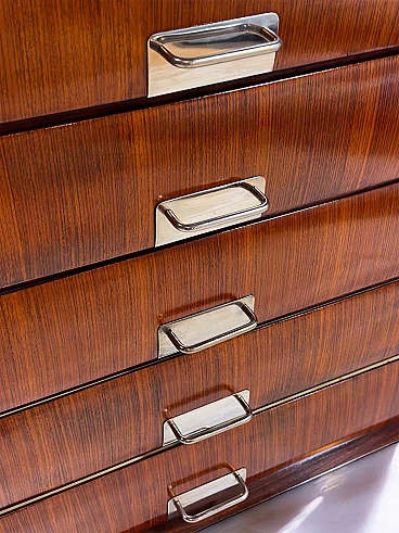 The teak wood radiates a beautiful warm orange hue and its visual impact, when seen in person, is undeniable, making this dresser an exceptional and versatile statement piece of mid-century Italian design.