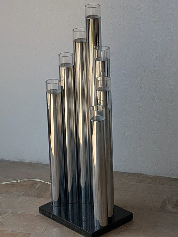 Experience the allure of Italian craftsmanship with this stunning 1970s Tubular Floor Lamp. Designed with an exemplary fusion of steel, transparent acrylic glass and marble this remarkable piece promises to infuse your space with a compelling blend of style, sophistication, and practicality. Constructed from seven steel and transparent acrylic glass tube-shaped pieces, each housing a light bulb within, this floor lamp radiates a captivating glow that is sure to enrich your home's ambience. Anchored by a robust rectangular marble base, this floor lamp stands as a testament to strength and stability. Its design elements are uniquely combined, creating a mesmerizing visual that seamlessly blends modernity with timeless elegance.