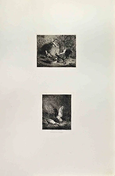Canards et Poules is a black and White etching realized by Francisco Gimenez in the 1860s. Titled in the lower.Image size: 32x13.Very good impression with wide margins and a very fresh inking.Realized for the "Société des Aquafortistes. Born on the initiative of the publisher Alfred Cadart, the Société des Aquafortistes had the aim of reviving etching which had slowly been replaced by the cheaper lithography. Among the first participants in the association were the Barbizon painters who helped raise the medium to new heights, but over 100 leading French artists contributed to the creation of the 300 engravings. With the publication of the last volume in 1867 the society, given the high costs and modest commercial success, was dissolved but new experiments were soon born: Félicien Rops, former member, founded the Société Internationale des Aquafortistes in Brussels in December 1869 , while in London The Portfolio and the Society of Painter-Etchers were born respectively in 1870 and 1880. In Paris, in 1873, the magazine Paris à l'eau-forte was founded.