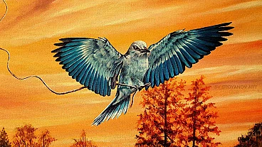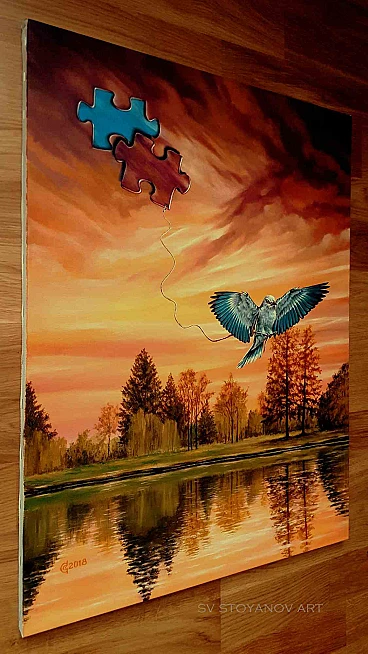 Oil painting, 2018. Certificate of authenticity by the author.In this oil painting, I've blended realism with surreal elements to evoke a sense of possibility and mystique. The vibrant sunset and its reflection on the serene water is a dance of nature's colors, imbued with a deep sense of calm. The soaring bird, tethered to a puzzle piece, symbolizes the quest for understanding and connectivity in our world. This piece is a passionate invitation to ponder the beauty of the intertwined mysteries of nature and life. It will bring a dynamic energy and a thought-provoking ambiance to any space.