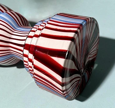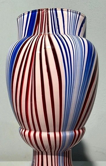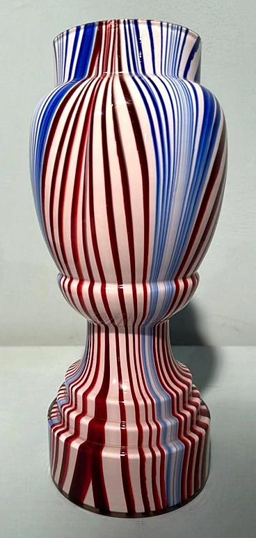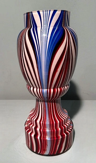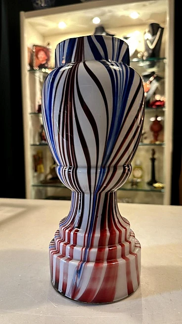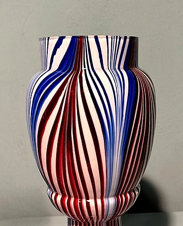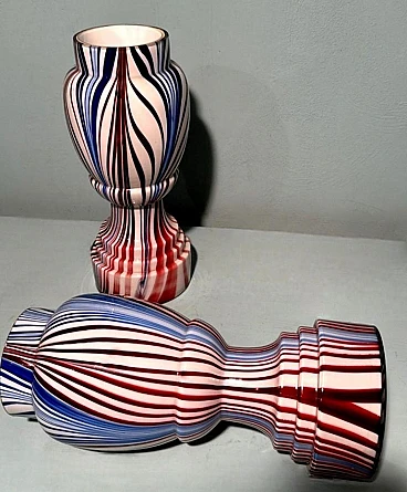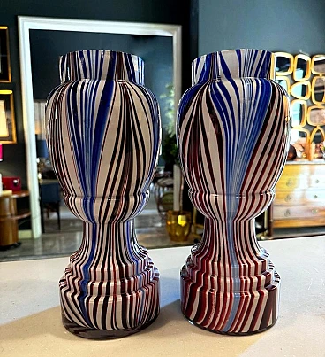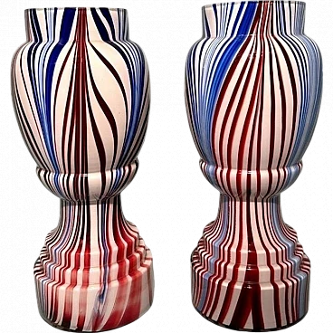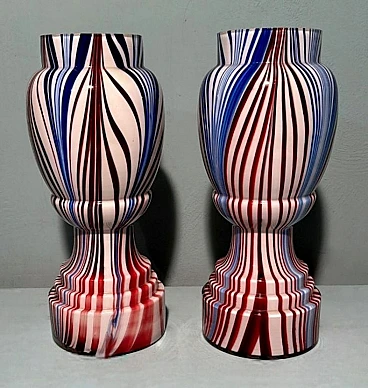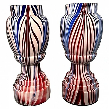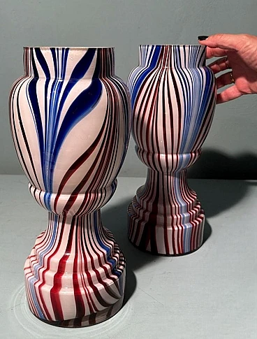 This exquisite pair of distinctively shaped colored opaline glass vases was blown in one piece (body and base) without seams and then expertly shaped by the skilled craftsmen of the Clichy glassworks in France between 1860 and 1865. Although these pieces bear no maker's marks, we can attribute them to Cristallerie de Clichy with a high degree of certainty. Clichy typically used labels that have since been lost over time. The authenticity of these vases is confirmed by the unique opaline glasswork and the company's characteristic design; examination then of the bottom of the vessels (see photo) is another confirmation of the uniqueness of the hand-making process. The most complex and remarkable aspect of producing these vases was leaving the interior in white opaline glass while applying different colors to the exterior. Colored oxides were added once the draft of the white opalescent vase had just emerged from the kiln. At the precise moment when the colors began to blend and fuse with the white, the craftsman skillfully and quickly blew and shaped the vase, ensuring the colors remained only on the surface, like brushstrokes, without penetrating deeper. The vase was then briefly returned to the kiln and rapidly cooled. This delicate process is reserved for Master Glassmakers due to its complexity. Cristallerie de Clichy is a historic French glass and crystal manufacturer, renowned for its high-quality production during the 19th century. Founded in 1830 in Clichy-la-Garenne, near Paris, the factory played a pivotal role in the history of French art glass, standing out for its production of fine crystal items, including glasses and decorative pieces. Specializing in blown glass, the factory became famous for its ability to create colored glass using innovative techniques. Alongside vases, Cristallerie de Clichy's output included glasses, goblets, bottles, and chandeliers, all made with meticulous attention to detail and advanced techniques for their time. By the mid-19th century, the factory was considered one of France's premier glass manufacturers, alongside other glassworks like Baccarat and Saint-Louis. Its products were highly regarded both in France and internationally, and the factory participated in numerous international exhibitions, including the Universal Exhibitions, where its work received awards for artistic and technical excellence. Despite its prestigious reputation, the factory closed in 1870. However, its creations have endured as a testament to the craftsmanship of the era. Cristallerie de Clichy played a crucial role in solidifying the international reputation of French glassmaking. Although the company is no longer in operation, its influence on glass and crystal production remains evident, with many of its products displayed in museums and private collections worldwide. Its legacy continues to inspire contemporary glass and crystal craftsmanship in France, having set high standards for quality and innovation. The vases are in good condition. The dimensions of each vase are: 13 cm in diameter and 31 cm in height.