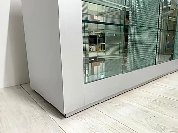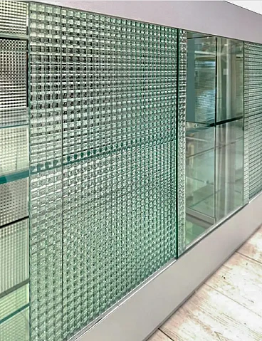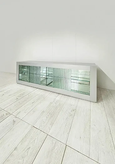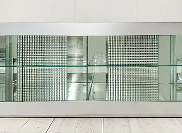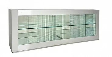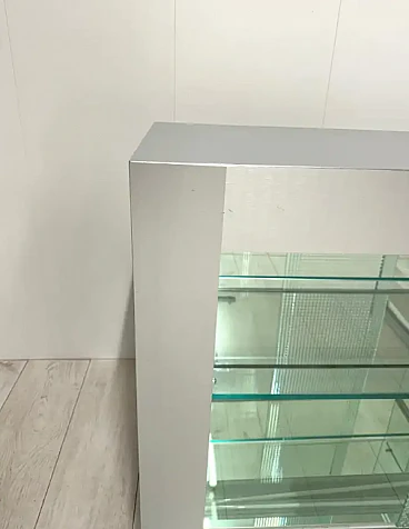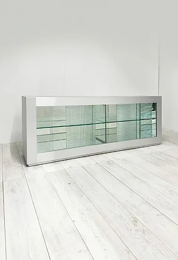 Luminous storage unit with aluminium panelling, shelves and glass doors, mirror interior. Nanda Vigo's designs stem from the concept of chronotopia, according to which the spatio-temporal perception of a space is modified by the movements of light and reflective surfaces that create illusory perspectives. Her mirrored furniture and light objects are never conceived as stand-alone, but created ad hoc to dictate the character of an interior.