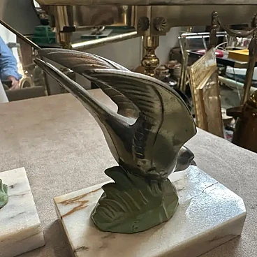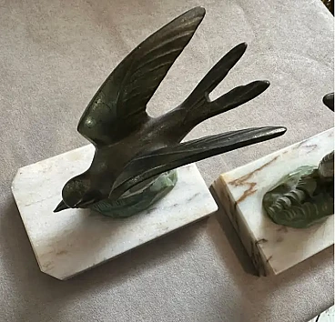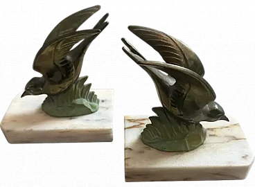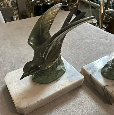 This pair of bookends has been an elegant addition to a desk, bookshelf, or study during the Art Deco period. Today, such items are cherished for their craftsmanship, unique design, and as collectible pieces reflecting the stylish refinement of the 1930s. They are in very good condition overall. The birds are sculpted in a dynamic, forward-leaning pose, evoking a sense of motion and elegance typical of Art Deco aesthetics, crafted from spelter (a popular material in 1930s Art Deco sculptures), and finished in a patinated bronze tone. Each bird rests on a rectangular marble base. The marble’s smooth, solid quality contrasts with the textured, dynamic appearance of the birds, creating a balance between the organic and the geometric. The bookends exemplify the geometric and streamlined forms of Art Deco, emphasizing symmetry, sleek lines, and stylized natural motifs. The combination of metal and marble was a hallmark of French Art Deco bookends and small sculptures, representing a mix of opulence and modernity.