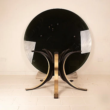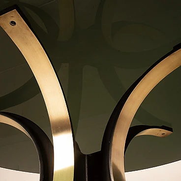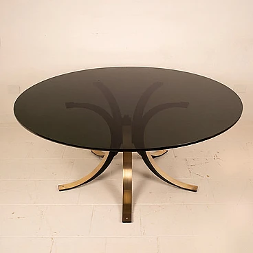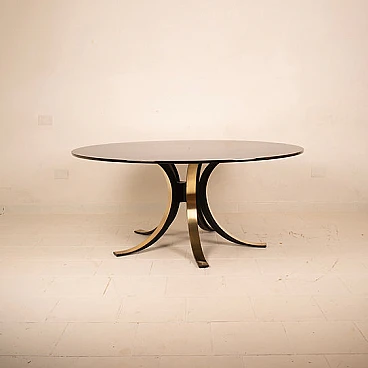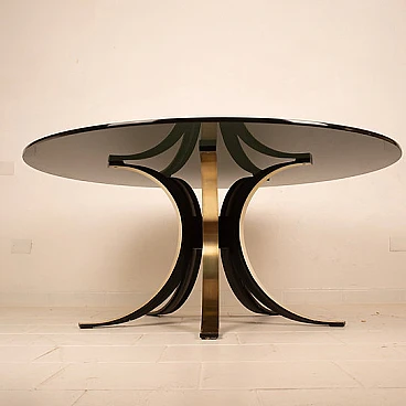T69 table in the 5-legged XL version designed by Osvaldo Borsani in collaboration with Eugenio Gerli at the end of the 1950s for the Tecno SPA company. The table is made of solid painted aluminum with brass foil fronts with a brushed finish, it has 5 legs with an original round smoked glass shelf 14mm thick, which has 5 precisely made recesses that allow it to be positioned exactly on the base . The glass is in excellent condition, practically perfect, without scratches or chips and the base shows some small signs of aging, as shown in the photographs, given its almost 70 years. The paint in the center has been finely restored. Overall it is in excellent vintage condition, restored and remains a very rare collector's item for admirers of one of the most important designers of the 20th century. Diameter 150 cm.