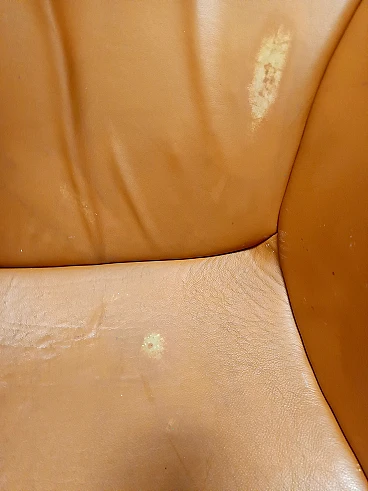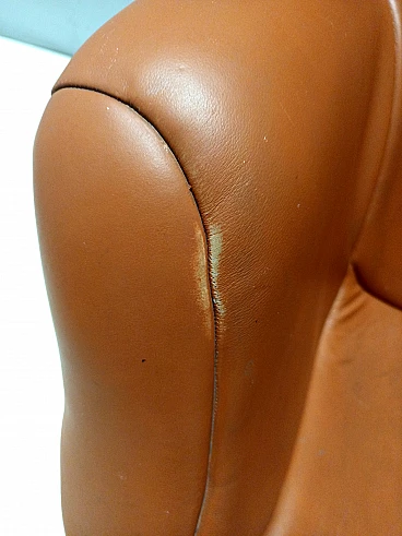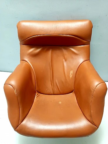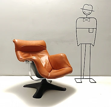 Made in Finland, 1970s. Ergonomically shaped and enveloping lounge chair by Yrjo Kukkapuro. It has a chrome bar that is meant to be the suspension for the chair, and features a fiberglass seat shell and base. This lounge chair turns 360 degrees and tilts back. It is among the most comfortable and elegant chairs made in the 1970s, and in addition to this, its orange upholstery gives it an even more futuristic touch, perfectly representing the Space Age design. This lounge chair has been reupholstered with orange leather in the 90s. It might show slight traces of use since it's vintage as shown in the pictures, but it can be considered as in very good condition and ready to become a piece in a home. This lounge chair features its original label. Width: 80 cm Depth: 89 cm Height: 97 cm