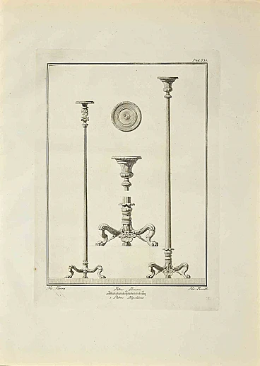 Ancient Roman Decorations is an etching on paper realized by Nicola Vanni in the 18th Century. Signed on the plate. Good conditions. The etching belongs to the print suite “Antiquities of Herculaneum Exposed” (original title: “Le Antichità di Ercolano Esposte”), an eight-volume volume of engravings of the finds from the excavation of the ruins of Herculaneum in the Kingdom of Naples (now Campania, Italy). It was published between 1757 and 1792 by the Regia Stamperia, and copies were delivered to selected recipients across Europe. Despite the title, the Antiquity of Herculaneum shows objects from all the excavations undertaken by the Bourbons in the Gulf of Naples. These include Pompeii, Stabia and two sites of Herculaneum: Resina and Portici. The Bourbon King Carlo appointed fifteen scholars creating a new “Herculaneum Academy” to study the artifacts and publish the results of the archaeological excavations of the sites.The engravings are of high quality and the accompanying text shows a large scholarship. They were realized by 25 prominent artists involved by the King to prepare drawings and engravings on the finds, among which we can find Giovanni Elia Morghen, Carlo Nolli, Luigi Vanvitelli and Giovanni Battista Casanova.The “Antiquities” was designed more to amaze readers with the quality of the objects in the collection of the King of Naples than to be used in research., following and increasing the interest of 18th century society for the classical culture and Art in particular.Through the exaltation of the classical concept of proportions and harmony, the book was of inspiration to the neoclassical movement in Europe, giving artists and decorators access to a huge shop of Hellenistic motifs. Ref.: National Gallery (Washington), Mark J. Millard Architectural, IV (2000), no. 1; L. Garcia y Garcia, Nova bibliotheca pompeiana (2 v., 1998); Royal Institute of British Architects, British Architectural Library ... Early printed books, 1 (1994), no. 112. U. Pannuti, 'Incisori e disegnatori della Stamperia Reale di Napoli nel secolo XVIII: la pubblicazione delle Antichità di Ercolano', in Xenia antiqua, 9 (2000), p. 151-178; V. Trombetta, 'L'edizione de Le Antichità di Ercolano esposte' in Rendiconti dell'Accademia di Archeologia, lettere e belle arti di Napoli , 59 (1984), p.151-172.