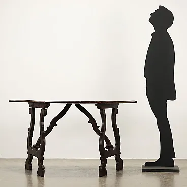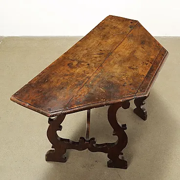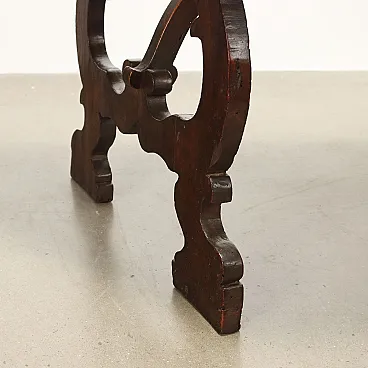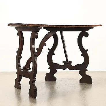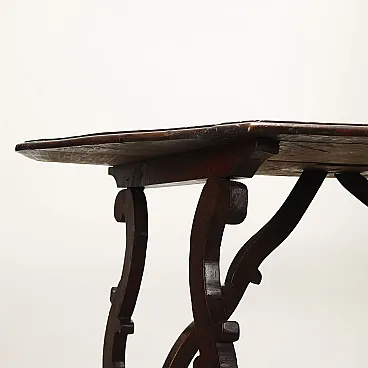 Baroque refectory console, supported by shaped and carved lyre legs, with a motif also repeated in the arrows; the latter have been moved from their original position, the anchoring nails between the top and the legs have been replaced.
