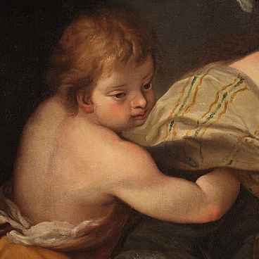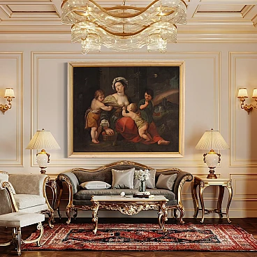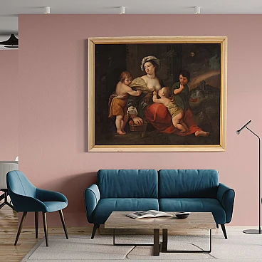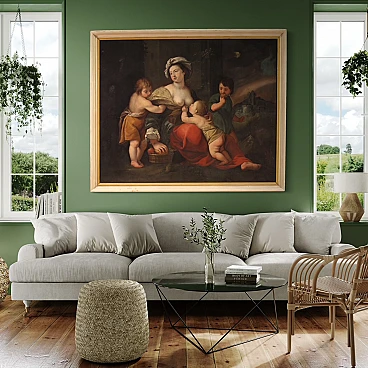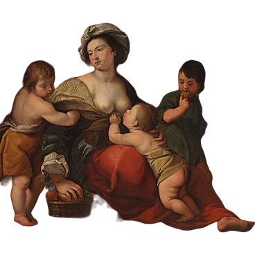 Splendid 17th century Italian painting. Oil on canvas work of notable pictorial quality attributable to the Lombard painter Giuseppe Nuvolone (1619-1703), lacking authenticity. Son of the painter Panfilo, he trained with his older brother, Carlo Francesco Nuvolone. At the center of the composition we find a beautiful young woman who lovingly looks after three children. It is the most classic allegorical interpretation of charity, the third of the three theological virtues after faith and hope. To underline the executive quality in every single detail, from the splendid landscape with ruins in the background to the precious details of the robes. Painting of considerable size, suitable for a large reception room. 20th century frame in carved and painted wood, beautifully decorated, with some signs of aging. Work already restored with relining, replacement of the frame and color recovery in small spots. Overall, it is in an excellent state of conservation. Light painting H 141 x W 175 cm.