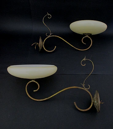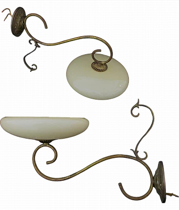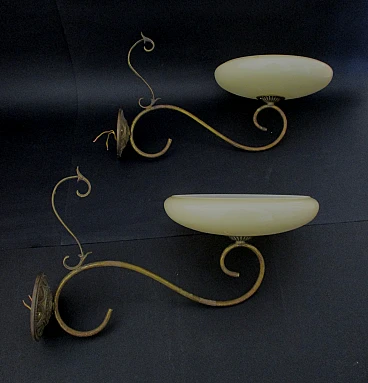 Wonderful antique large pair of French Liberty wall lamps from the 1900s, made of brass with splendid blown glass lampshades, fitted with E14 lamp holders with porcelain ring, very beautiful and of notable scenographic impact thanks also to the details made with accuracy and refinement, ideal as an object of furniture, any lighter areas are due to the reflection of artificial light, excellent used condition, fully functional and as shown in the photos. Dimensions: height cm. 26 - width cm. 23 - length cm. 41