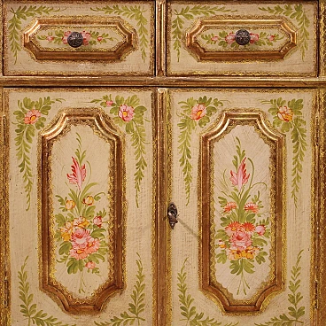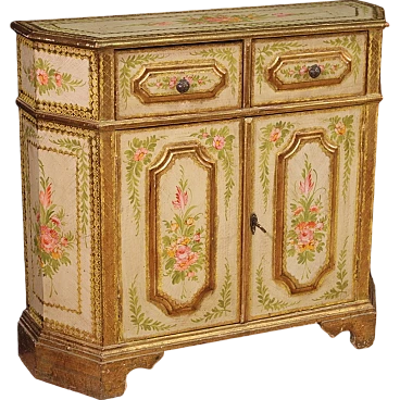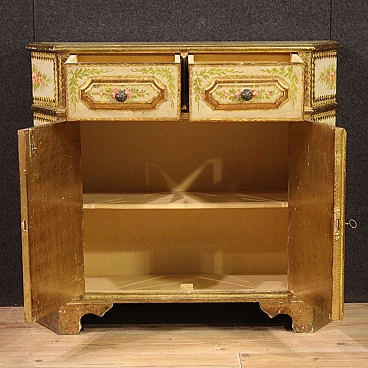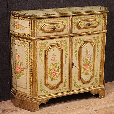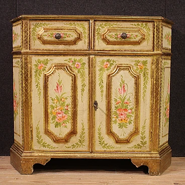 Small Venetian sideboard from the mid-20th century. Corner piece of furniture in lacquered, gilded and painted wood with very pleasant floral decorations. Sideboard equipped with two parallel drawers placed under the wooden top also lacquered and painted. Cabinet complete with two doors which offers two support surfaces inside. Sideboard of excellent proportions, easily placed in different parts of the house, for antique dealers and interior designers. Complete with a working key, it has some small discoloration (see photos). Structurally sound, overall in good state of conservation.